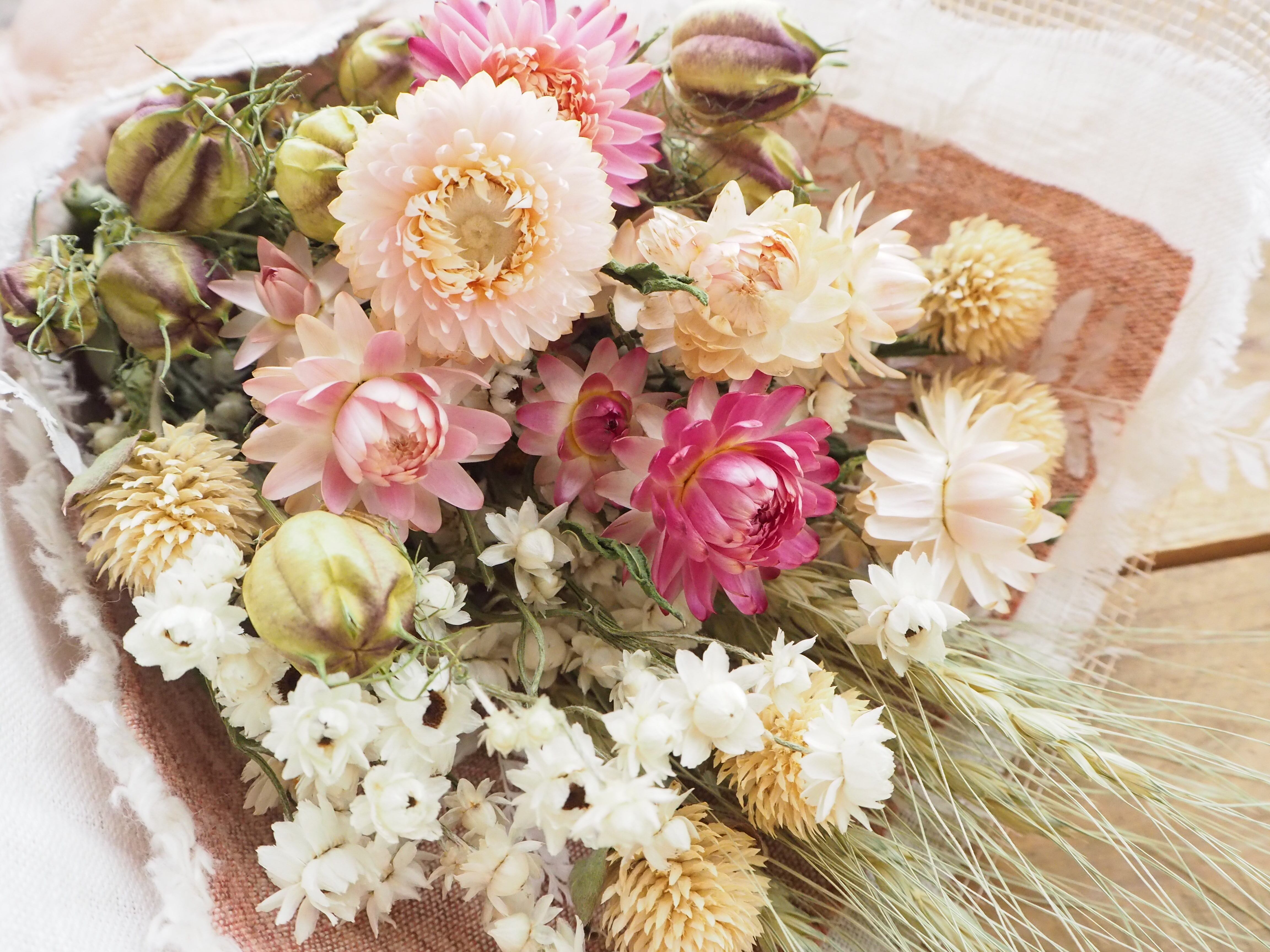 自然農法にこだわられた花農家さんから仕入れた花々を丁寧に束ねました。