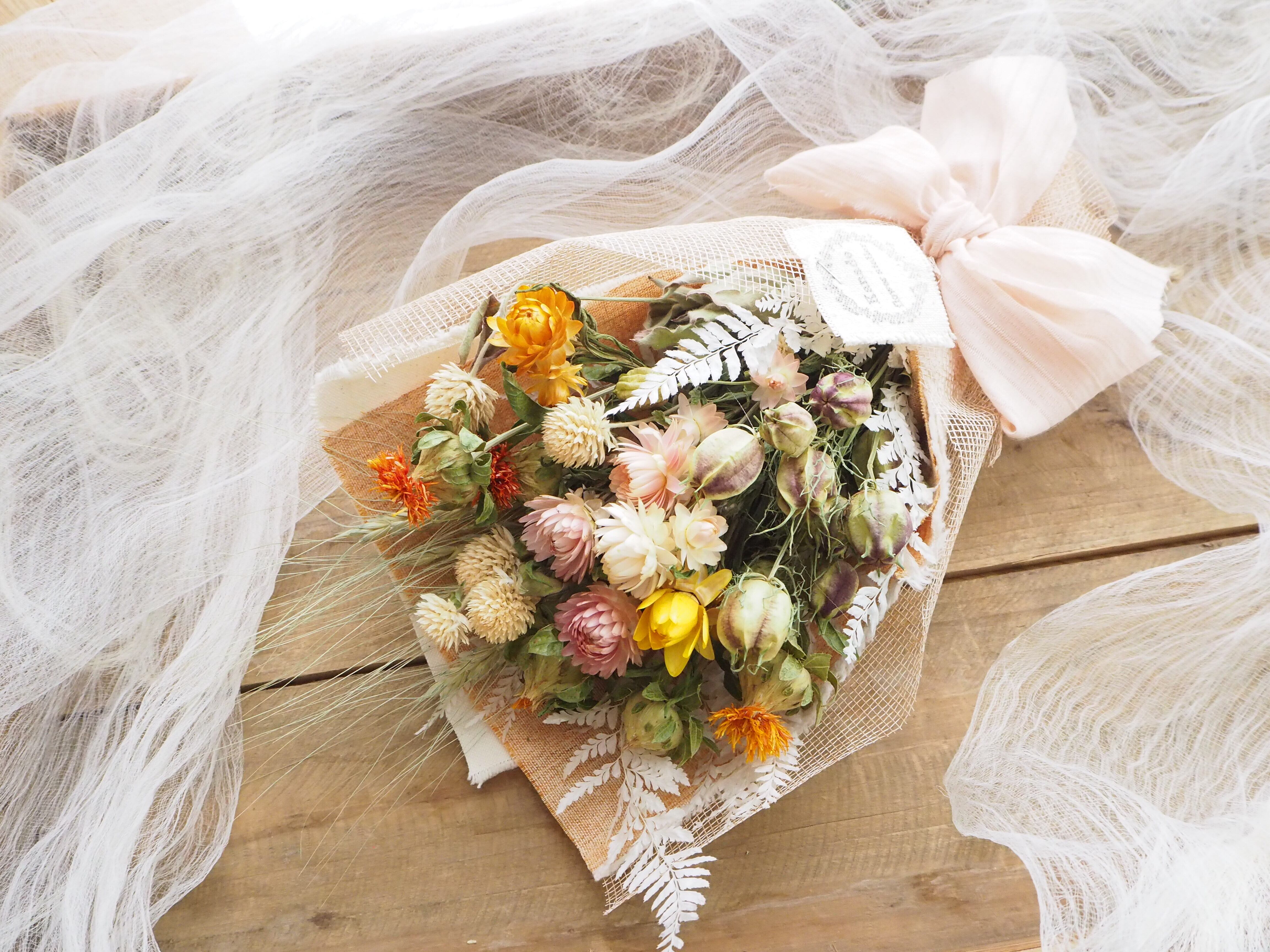 自然農法にこだわられた花農家さんから仕入れた花々を丁寧に束ねました。