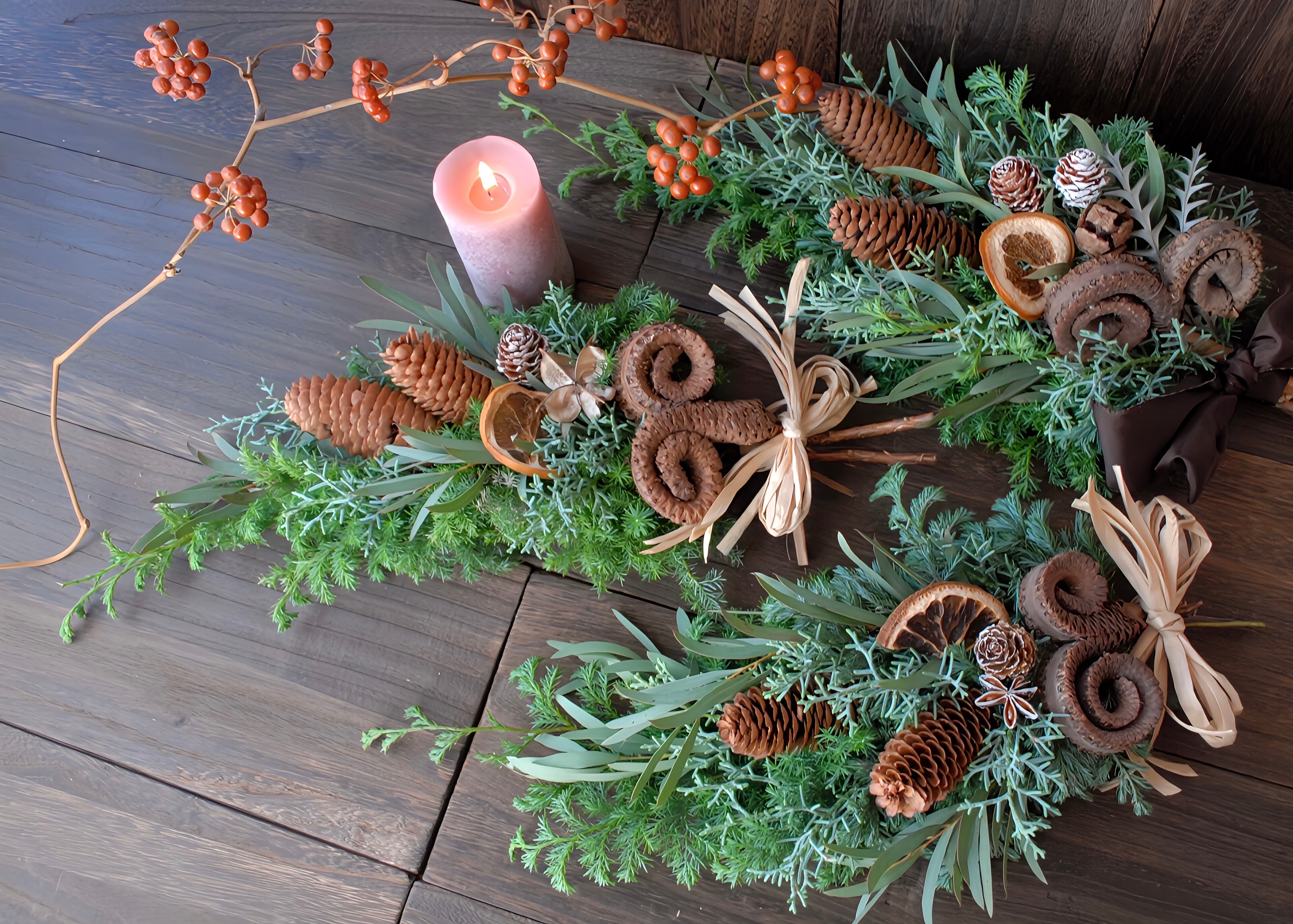 フレッシュの木々を束ね、Xmasガーランドをお作りしました。